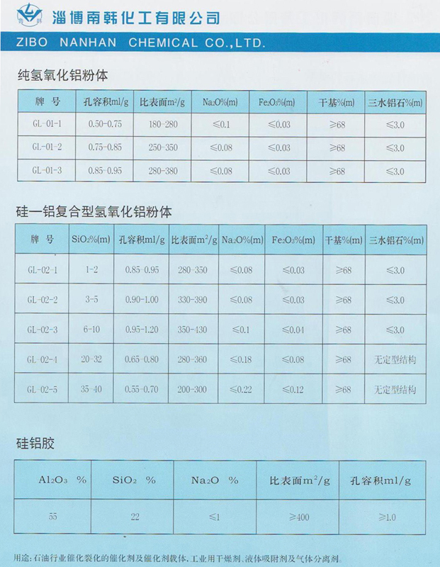 本產品主要用作催化劑載體—活性氧化鋁的原料,如作為加氫催化劑原料以及用作制造加氫催化劑載體、氧氯化催化劑載體等。也可用作分子篩、硅酸鹽耐火纖維制品的成型粘結劑、如作為半合成稀土 Y 型分子篩裂化催化劑的粘結劑。本產品是作各種鋁鹽的良好原料,經成型加工后,可作不同形狀的干燥劑、吸附劑和催化劑載體。